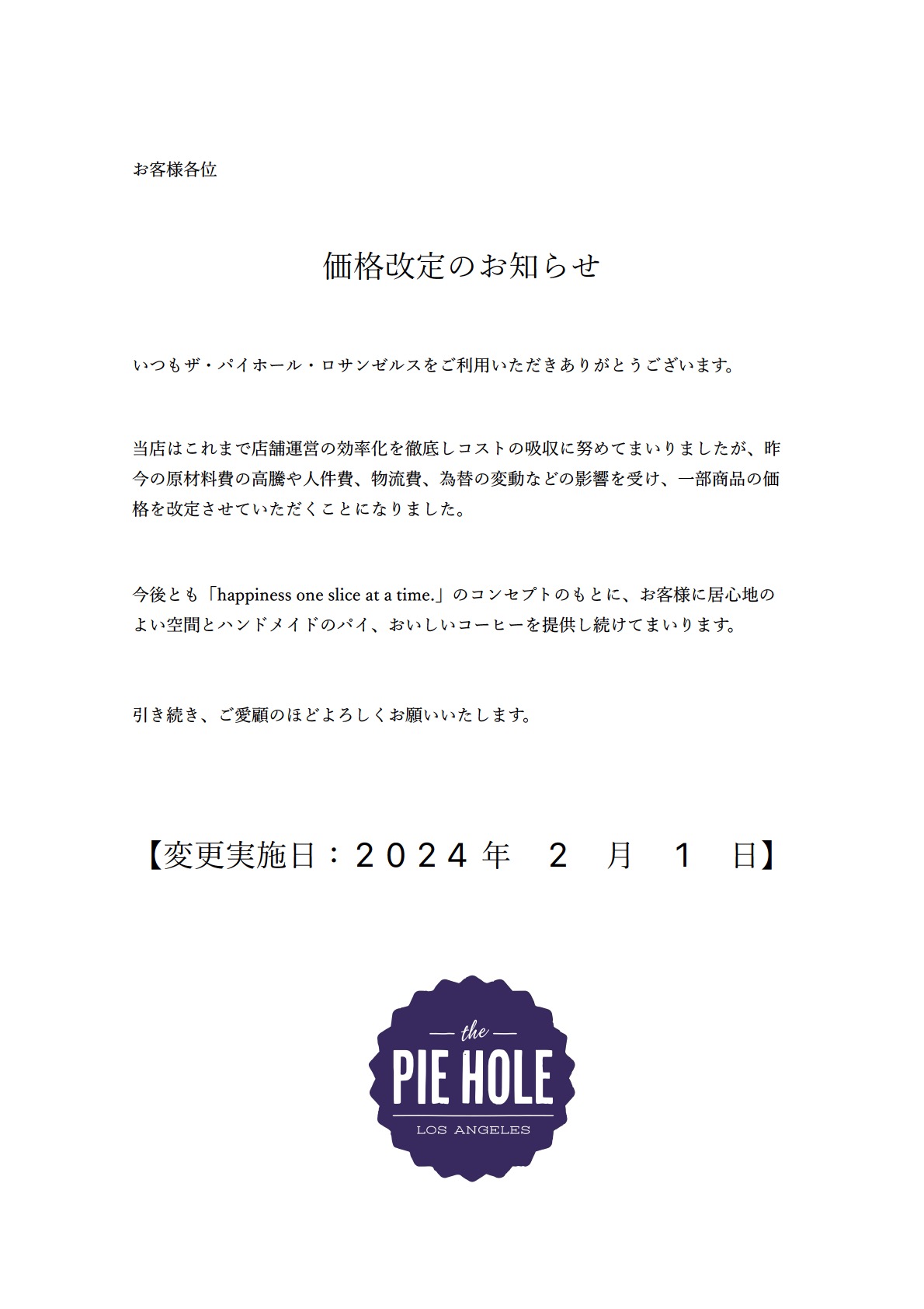 アメリカで代々5世代に渡り受け継がれてきた秘伝のパイレシピをもとに創業者マシュー・ヘフナーさんが2011年アメリカ・ロサンゼルスにパイショップを開店。伝統的なアメリカンパイ専門店「The Pie Hole Los Angeles」はアメリカ・ロサンゼルスの口コミランキング「カフェ・喫茶店部門」で人気No.1を獲得。秘伝のパイレシピで焼き上げた美味しいアップルパイ、チェリーパイ、シェパーズパイ、マッケンチーズパイなどの人気が拡がり、現在ではハリウッドやサンタモニカ、ダウンタウン、サンディエゴ、パサデナ、アナハイム地域へも出店しております。
